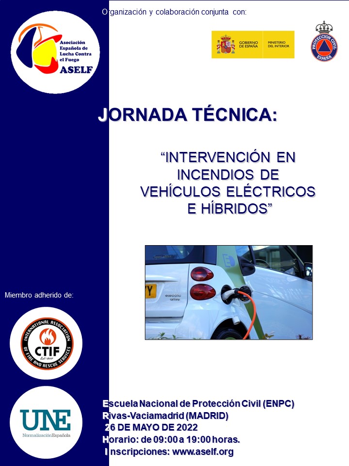 Inscripciones abiertas para la jornada técnica del próximo día 26 de mayo sobre “Intervención en incendios de vehículos eléctricos e híbridos”, organizada por ASELF junto con la Dirección General de Protección Civil y Emergencias del Ministerio del Interior.