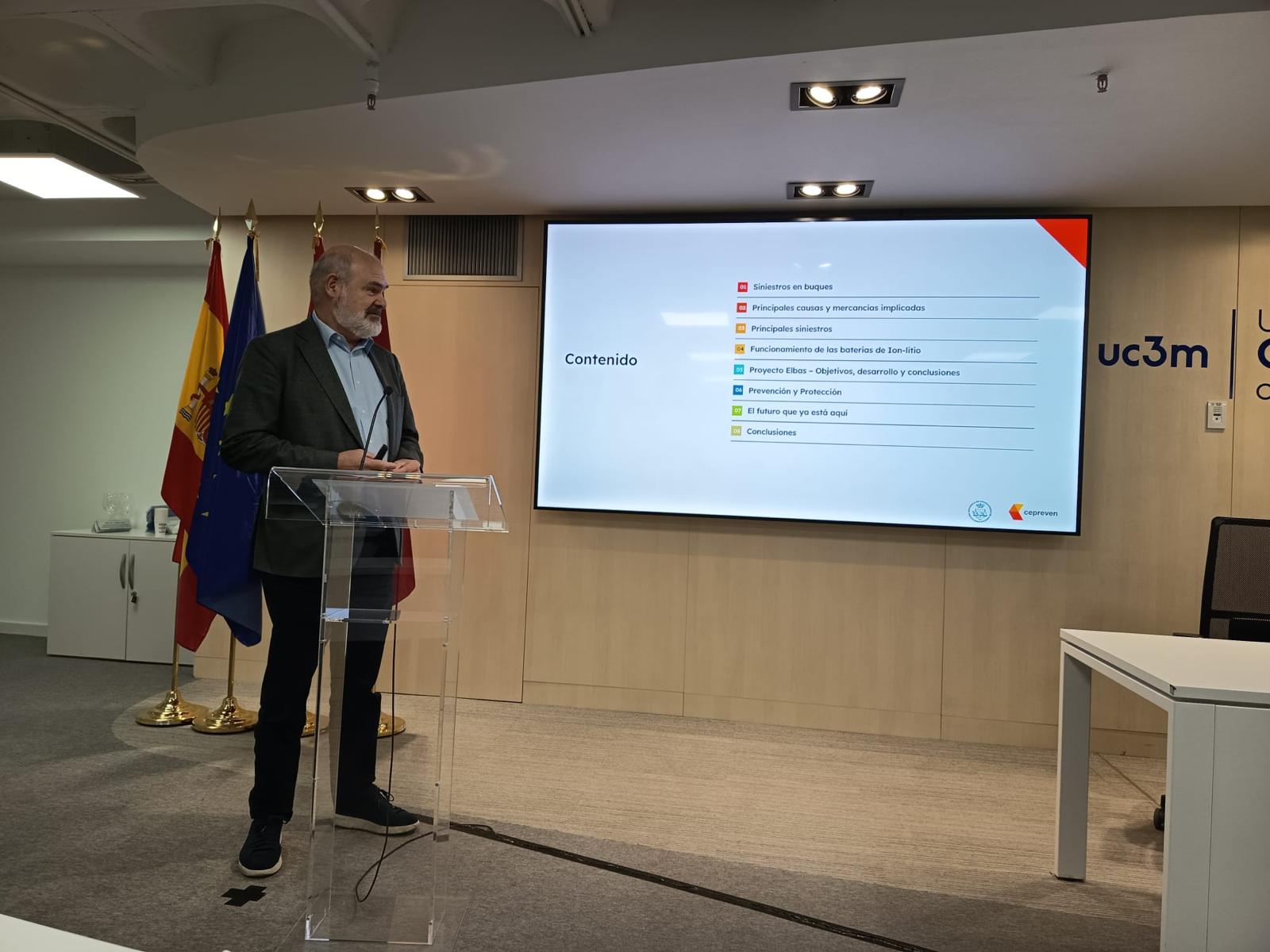 Jon Michelena, Director General de Cepreven, expuso una visión integral sobre los riesgos inherentes al transporte marítimo de mercancías y las medidas necesarias para prevenir y mitigar los incendios a bordo, temas cruciales: