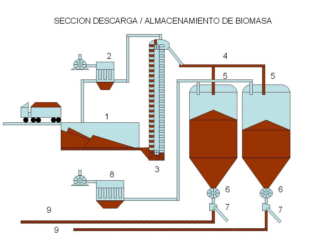 A continuación se muestra un esquema básico de la sección de Descarga / Almacenamiento de una planta de Biomasa.