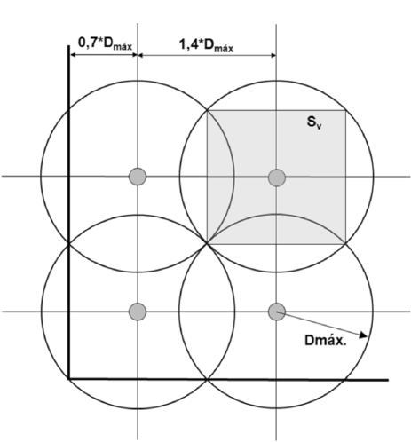 Podríamos decir que al aplicar el valor de Dmax aseguramos que el número de detectores instalados esté correctamente distribuido. Como se observa en la figura, lo máximo que se admite es que los círculos correspondientes a Dmax sean tangentes, y sobre todo, no hay un solo punto que no esté dentro de la superficie vigilada por al menos un detector. Sin embargo, aunque la figura aclara bastante el concepto, puede inducir a error al señalar una superficie vigilada cuadrada. La superficie vigilada se define por las líneas centrales trazadas a medio camino en ángulo recto sobre las líneas que unen detectores vecinos. Estirando o encogiendo la separación entre detectores a lo largo del eje x o y se obtendrá una Sv con una forma más o menos rectangular. Una mayor separación a lo largo del eje x puede compensarse con una mayor proximidad en el eje y, para que el producto de ambas se mantenga por debajo de Sv. Sin embargo, esto tiene un límite, y ese límite lo marca Dmax.