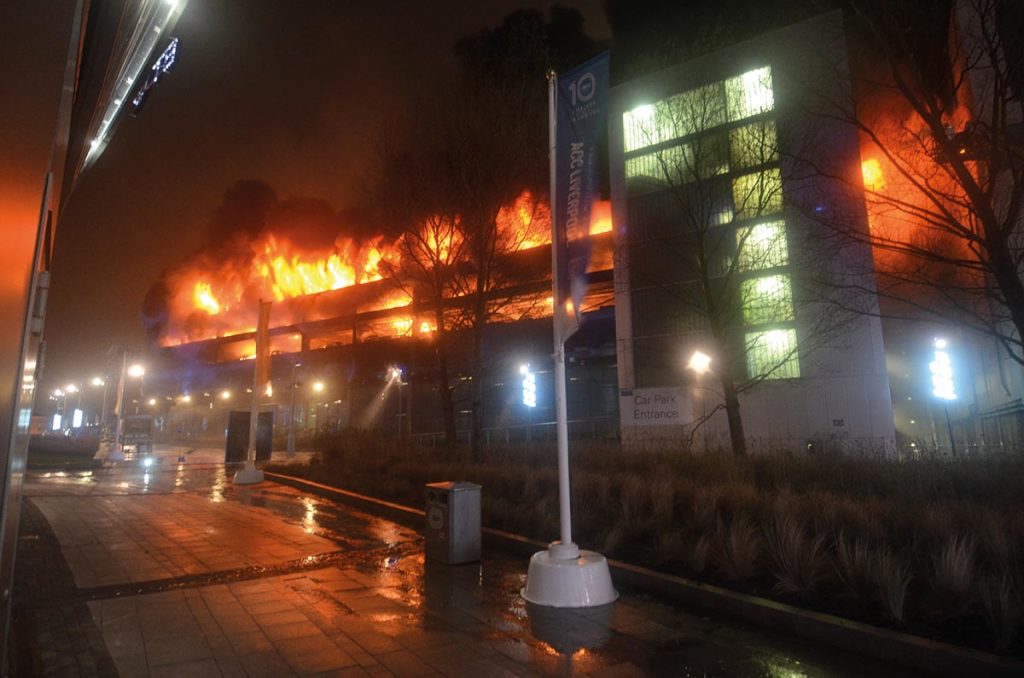 El 31 de diciembre, se desencadenó un incendio en un automóvil en un aparcamiento en Liverpool. El aparcamiento era un edificio de hormigón completamente abierto, muy parecido a los que existen en Dinamarca. Lo que es totalmente desconocido es la forma en que se desarrolló el fuego. A pesar de una rápida llamada a los bomberos, un plazo de intervención de ocho minutos y 21 vehículos de respuesta a la llamada de emergencia, los bomberos no pudieron evitar que el fuego se propagara entre los coches y el techo de esa planta, causando la destrucción de 1.400 coches y del propio edificio. Ahora se plantea el interrogante de cómo pudo suceder.